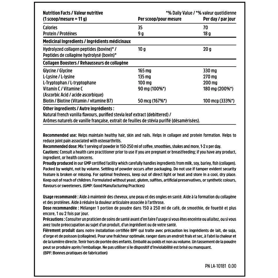 - Hydrolyzed collagen peptides (bovine): 10 g